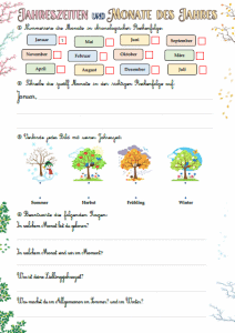 Dans le premier exercice, il faudra numéroter dans l’ordre chronologique les 12 mois de l’année. Dans le second exercice, il faudra écrire dans l’ordre ces 12 mois. Dans le troisième exercice, il faudra relier chaque image à la saison correspondante et entourer sa saisons préférée. Enfin, dans le dernier exercice, il s’agira de répondre aux questions suivantes : In which month were you born? What month are we in right now? What is your favorite season? What do you generally do in the summer? and in the winter?